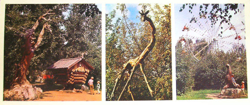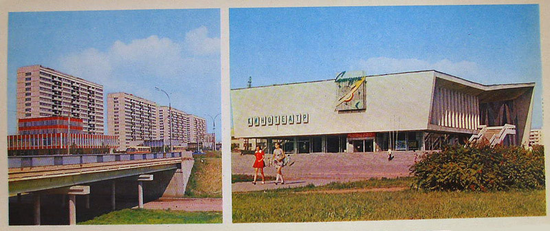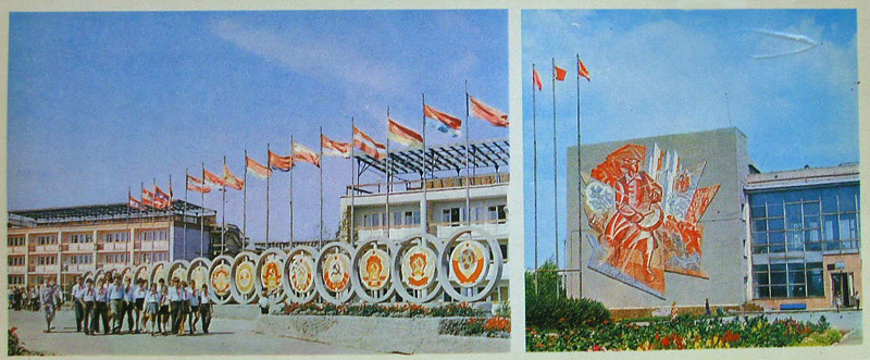 Слева пионерский лагерь «Алые паруса». С того времени изменилось мало что: флаги не весят, нет пионеров и на зданиях нет странных железных конструкций. Справа Дворец пионеров. Дворец еще стоит в неизменном виде. Только флаги не весят.